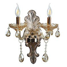 Arbotante de pared palace Gamalux, apto para espacios interiores como salas, pasillos o habitaciones. Está elaborado de metal y cristal cortado color champagne brillante, su diseño con 2 velas brinda un toque clásico y elegante a la decoración. Sus dimensiones son 41 x 24 cm y un peso de 3 kg. Trabaja con 2 sockets E12 para focos LED (no incluidos).