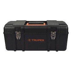 Caja de herramientas reforzada de 23 pulgadas Truper, útil para almacenar y facilitar el transporte de herramientas pequeñas o medianas. Está elaborada con polipropileno negro de calidad industrial que le dan la resistencia necesaria para soportar el peso en su interior. Su estructura cuenta con mango en la parte superior de su tapa, para llevarla con comodidad. También tiene broches metálicos que permiten un cierre seguro de la caja, así como una charola que permite organizar piezas pequeñas. Sus dimensiones son 25 x 58 x 26.5 cm.