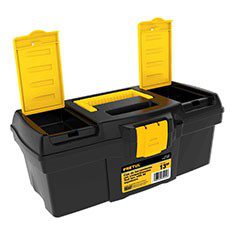 Caja plástica para herramientas 13 con compartimentos, fabricada en polipropileno. Caja, charola y broche fabricados en polipropileno de alto impacto. Charola interior removible. Asa abatible y orificio para candado. Refuerzos en esquinas, centro y parte inferior de la caja.