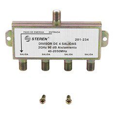Divisor de 4 salidas 2 Ghz Steren, cuenta con 90 dB de aislamiento y una entrada de alta frecuencia. Está fabricado con blindaje contra interferencia de radiofrecuencia de (90 dB RFI) y caja con aleación de zinc de larga duración y acabado anticorrosivo, tiene una resistencia eléctrica de 75 Ohms y pérdida por inserción de 3.4 a 5.5 dB. Cuenta con paso de voltaje en uno de los puertos y frecuencia de operación de 40 a 2050 MHZ, es muy útil en la distribución de señales de satélite.
