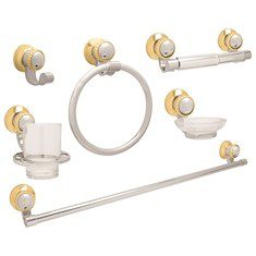 Juego de accesorios para baño Palmira Flowell, contiene 6 piezas gancho colgador, toallero de barra de 61 cm, porta jabonera, porta vaso, toallero de argolla y porta papel higiénico; también jabonera y vaso. Está elaborado en aleación de zinc, material resistente y duradero. Tiene un diseño clásico en acabado cromado pulido y dorado brillante que lo vuelve práctico y elegante. El empaque incluye accesorios de montaje y una guía ilustrada para su instalación.