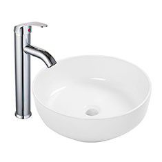 Lavabo ovalin de cerámica, de sobre poner. Incluye un monomando alto cromo, marca dica. Incluye mangueras para conexión a toma de agua, fría y caliente.