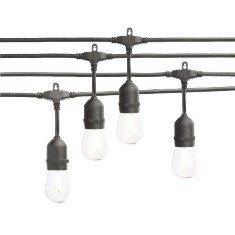 Serie de luces LED Hampton Bay, otorga iluminación en los exteriores e interiores del hogar, tiene un estilo moderno y es resistente a la intemperie. Cuenta con 24 bombillas LED Edison, se enchufa a corrientes de 120 volts. Cada foco brinda 40 lúmenes de potencia y luz blanca cálida de 2,220 K; también son resistentes a impactos y caídas. Está fabricada en plástico impermeable y duradero. Tiene un largo de 1,463.04 cm (48 pies) y la distancia entre bombillas es de 60.96 cm (2 pies). Pueden conectarse hasta 11 series a la vez en la misma corriente.