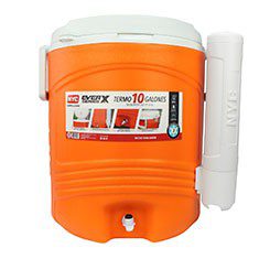 Termo 10 galones (37 litros), 1 pieza, naranja. Mantiene bebidas frías hasta por 3 días. Dimensiones: 48 x 44 x 54 cm. Válvula dispensadora de flijo rápido, resistente a filtraciones. Cómodas asas que facilitan su traslado. Tapa con 2 portavasos y canales de desagüe. Práctico dispensador de vasos. Aditamento para cerrar con candado. Tapa fácil de abrir. Gruesa capa aislante interior de poliuretano. Producto plástico elaborado con materiales de alta calidad, resistentes y durables. Su superficie lisa no permite el paso de la humedad ni la formación de hongos.